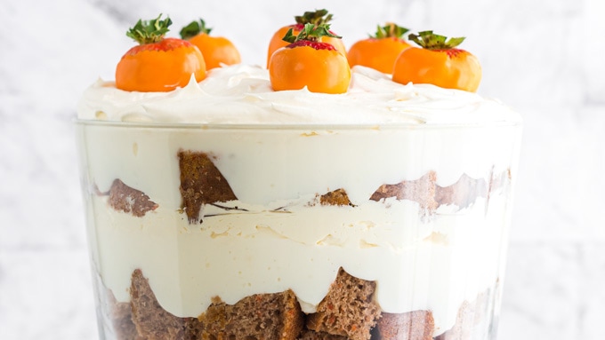 Carrot Cake | This carrot cake trifle has layers of moist carrot cake and no-bake cheesecake filling then topped with adorable strawberry “carrots”.