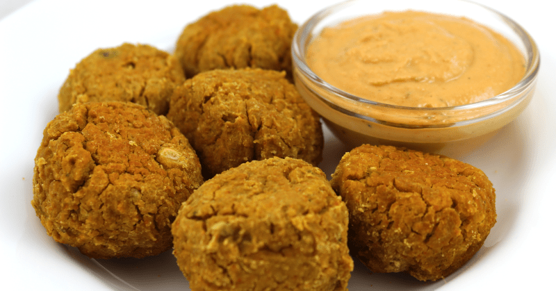 Falafel | Baked spiced chickpea falafel-style bites served with a sriracha tahini sauce